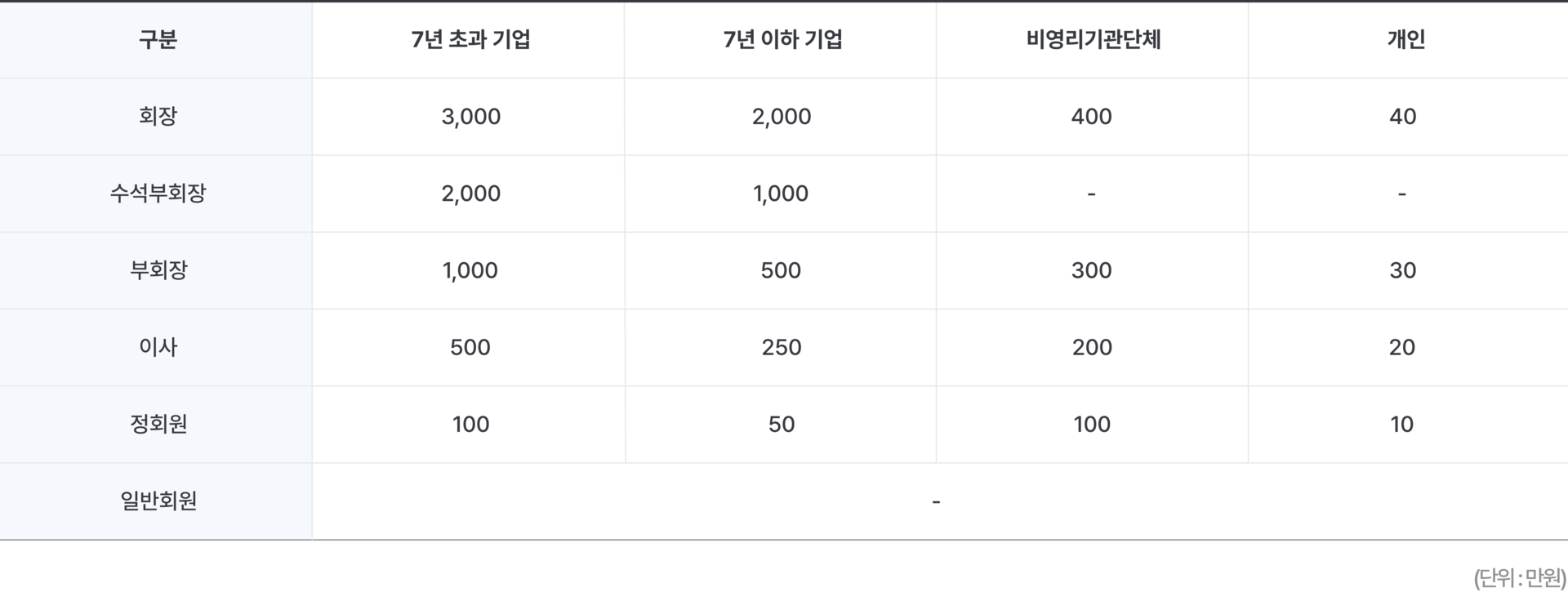 협의회 전체 회원 유형별 연회비 기준을